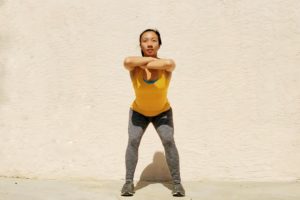 Start with your legs hip width apart or slightly wider. Toes will face forward.As you continue to progress in your fitness journey, you will find out that your stance can change from what I am setting here. I’m suggesting my feet placement as this for now because it is easier to see if your knees are tracking over your feet this way.