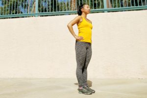 Stand up straight with your feet together, core engaged, and hands on your waist.