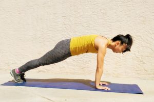 Start in a plank position. Make a straight line from your feet to the top of your head. Shoulders should be right above your wrists. Core tight.